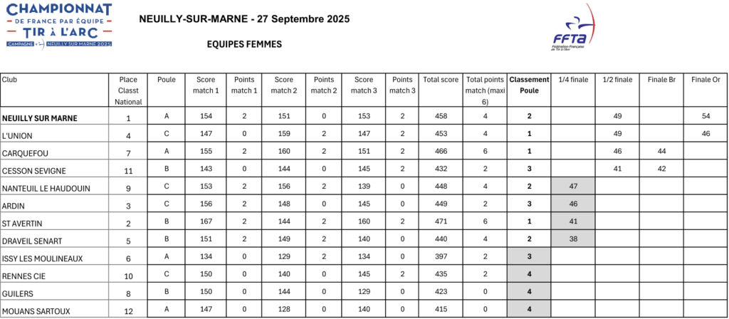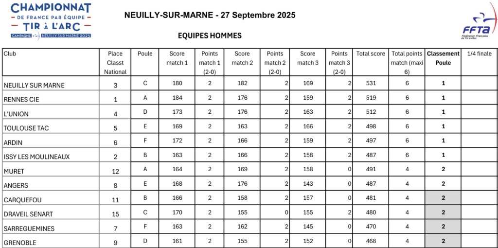 Elles affrontent en 1/4 l’Union, vainqueure de la Poule C, et 3ème de la phase de poule avec 453 pts. Sur une boucle de 4 cibles avec une flèche par archer, tout reste possible, mais les filles s’inclinent 38-42, et prennent la 8ème place de la compétition.
