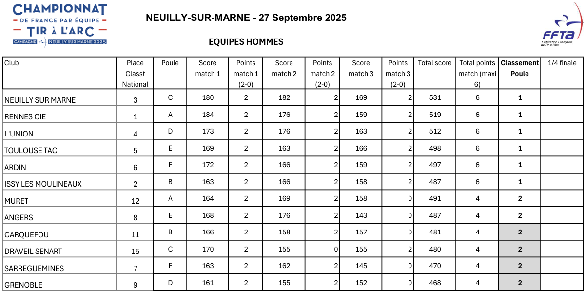 Elles affrontent en 1/4 l’Union, vainqueure de la Poule C, et 3ème de la phase de poule avec 453 pts. Sur une boucle de 4 cibles avec une flèche par archer, tout reste possible, mais les filles s’inclinent 38-42, et prennent la 8ème place de la compétition.
