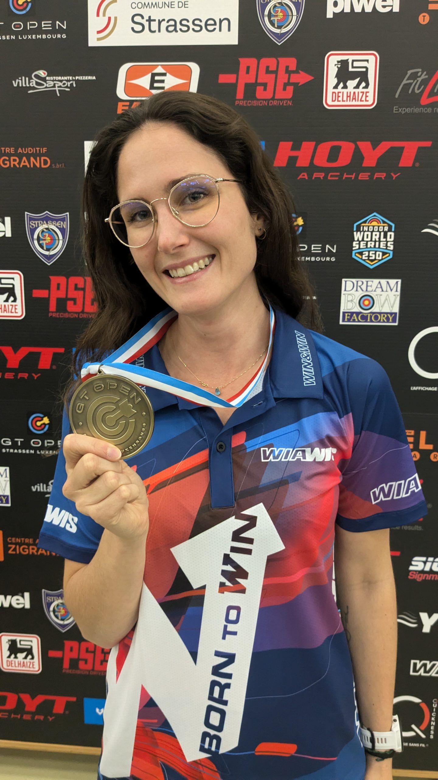 Jennifer DEVAUX avait remporté son premier podium international à Strassen en 2022, avec une médaille d’argent. Elle réalise à nouveau un excellent parcours cette année avec la 13ème place des qualifications (573). Après un premier tour remporté facilement 6-0 (28-26/29-28/28-27), elle affronte en 1/8 une première adversaire de taille, avec l’anglaise Healey Penny, 4ème des qualifications. Jennifer a su élever son niveau pour remporter le match 6-2 (29-27/29-30/28-27/30-29). Elle réussit à maintenir ce niveau ensuite pour s’offrir une place dans le dernier carré sur le même score (29-27/28-28/29-29/30-25). Mais en 1/2, elle se trouve face à Lim Duna, vainqueure du Las Vegas Shoot et de la finale des IWS 2024. La coréenne ne laisse aucune ouverture à Jennifer qui doit s’incliner 2-6 (29-29/28-30/26-29/29-29).